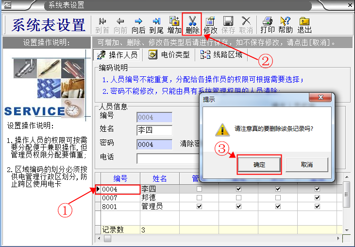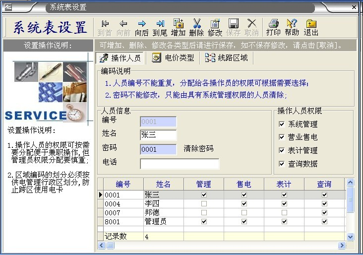 系統(tǒng)默認的管理人員有“張三、李四、德邦、管理員”。 其中“管理員”是最高權限擁有者,不能刪除。其它人員能夠隨意刪除增加。